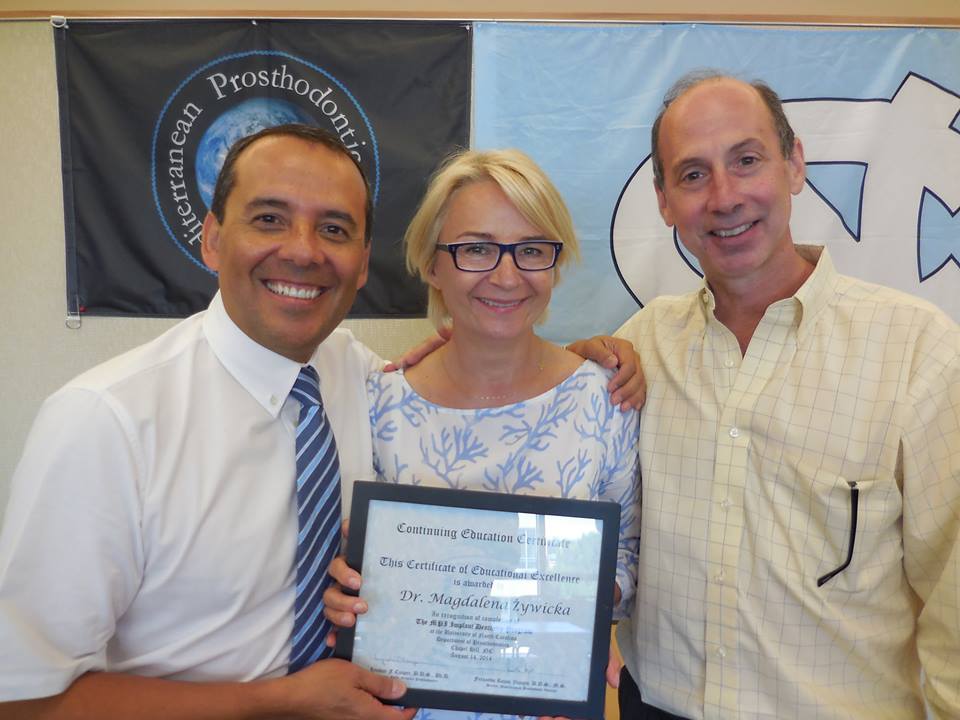DDS, MSc Magdalena Żywicka z dyplomem University of North Carolina & Mediteranean Prosthodontic Institute. Towarzyszą jej Dr Fernando Rojas Vizcaya i prof. Lyndon Cooper