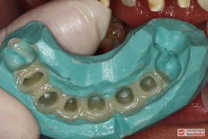 Powierzchnia okluzyjna łuku górnego – sześć filarów protetycznych tuż przed zacementowaniem koron