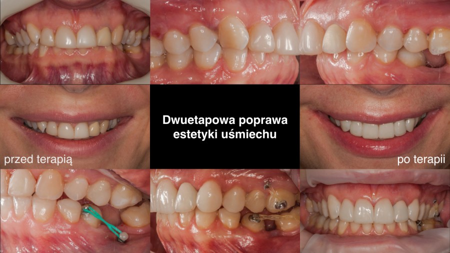 Młoda pacjentka bardzo zaabsorbowana zawodowo zgłosiła się do nas celem korekcji wszystkich defektów estetycznych uzębienia. Główną jej skargą była dwójka górna lewa, pokryta żółtą koroną metalowo-ceramiczną. Dotylna pozycja żuchwy oraz rozbudowana szczęka wskazują na wadę ortodontyczną. Piątka dolna lewa w zgryzie przewieszonym, ustanawia niewłaściwe zaguzkowanie wzajemne zębów. Z uwagi na ograniczenia czasowe pacjentki, leczenie zostało podzielone na dwa etapy.