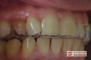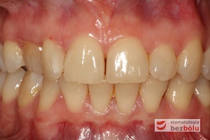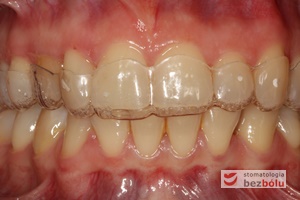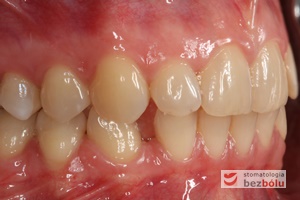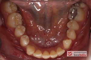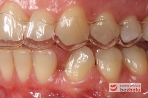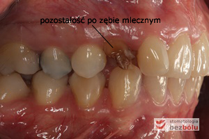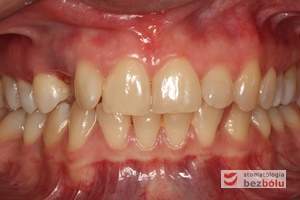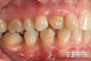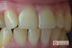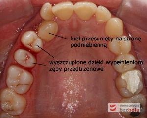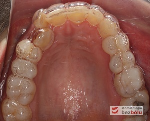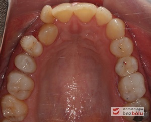 Celem zgłoszenia się 32-letniej pacjentki do naszego gabinetu była zniszczona próchnicowo przetrwała trójka mleczna, która w sposób rażący zakłócała estetykę uśmiechu. Trójka stała, po stronie prawej, ustawiona była dopodniebiennie z powodu zajęcia dla niej miejsca przez trójkę mleczną. Przez lata trójka mleczna uległa znacznej destrukcji. Pomysłem pacjentki na rozwiązanie jej problemu estetycznego było usunięcie zarówno trójki mlecznej jak i trójki stałej i założenie w to miejsce implantu. Lekarz implantolog Magdalena Żywicka przekonała Panią do zachowania trójki stałej i wprowadzenie jej na miejsce w łuku zębowym. Niedostateczna ilość miejsca dla kła (trójki) została wygospodarowana przez redukcję zębów przedtrzonowych i trzonowych w których zostały założone wypełnienia kompozytowe. Dystalizacja (przesuwanie do tyłu) zębów przedtrzonowych pozwoliło na uzyskanie dostatecznej ilości miejsca dla kła. Z uwagi na znaczną odległość dzielącą miejsce zamieszkania pacjentki od naszej kliniki i brak możliwości regularnych wizyt ortodontycznych niezbędnych przy leczeniu aparatem stałym została podjęta decyzja o zastosowaniu pozycjonerów do przesunięć zębów. Te ruchome wyjmowalne aparaty, w które została wyposażona pacjentka, dały możliwość osiągnięcia celu terapeutycznego jakim było wprowadzenie kła do łuku. Na zdjęciach pokazujemy niepełne efekty leczenia, ponieważ pacjentka w dalszym ciągu użytkuje trzecią serię pozycjonerów, aby ustawić kła w idealnej pozycji. Prezentowane poniżej efekty leczenia pacjentka osiągnęła w ciągu 5 miesięcy dzięki sumiennemu noszeniu płytek i dużej determinacji. Będąc z dala od kliniki przesyłała nam zdjęcia, które wykonywała samodzielnie. W naszej ocenie wystarczą 2 miesiące, aby idealnie spozycjonować kła.