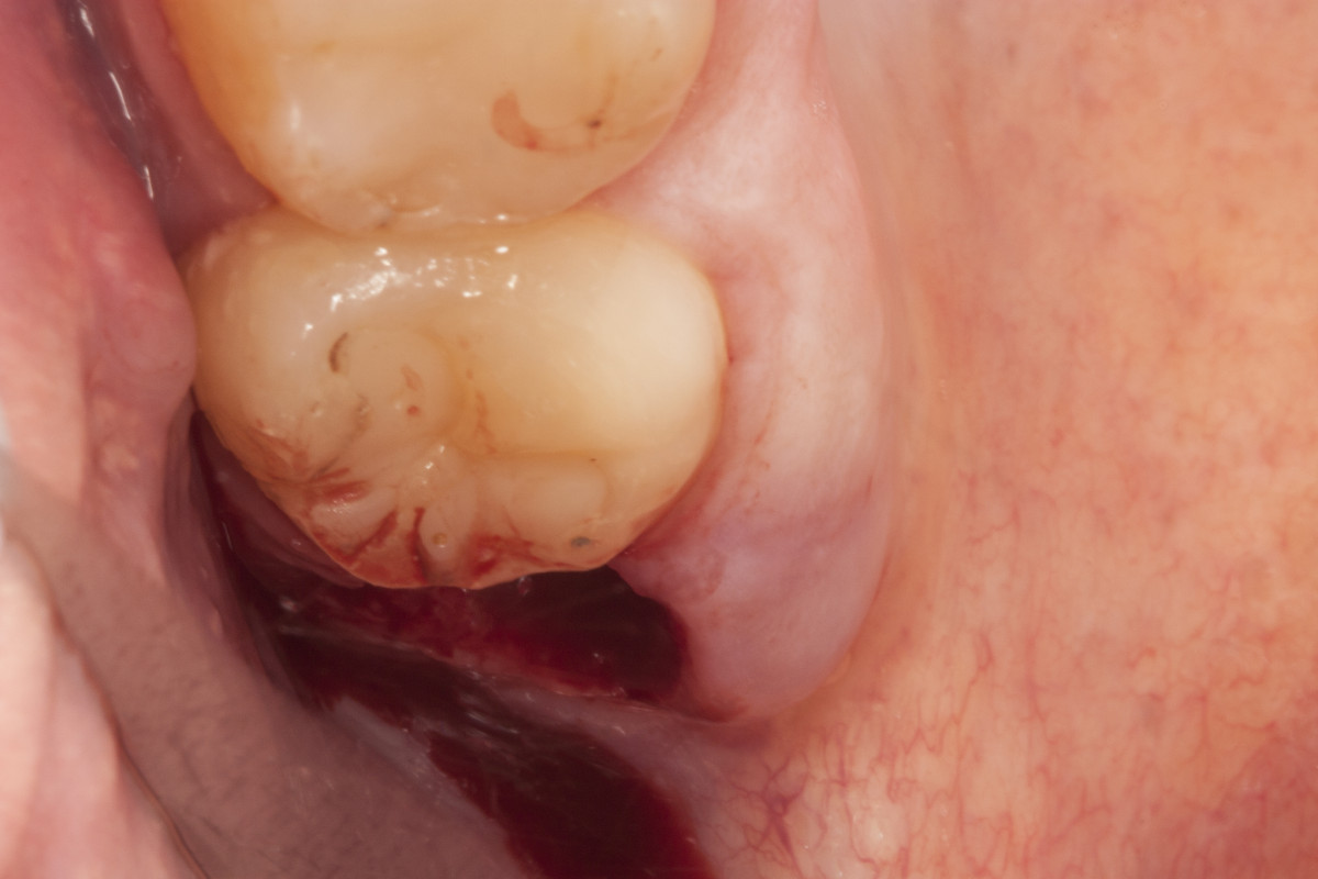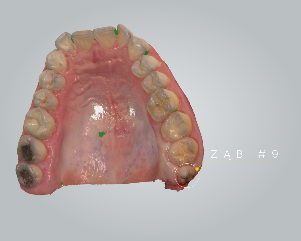 „Pacjent, który się zgłosił z dolegliwościami bólowymi górnej lewej szczęki, miał charakterystyczne objawy dla zapalenia ozębnej. Dzięki wykonaniu diagnostyki radiologicznej (zdjęcie pantomograficzne), ujawniono istnienie dziewiątego zęba, który był dodatkowo obciążony okluzyjnie. Pacjent miał otwarty zgryz – w momencie, kiedy zamykał zęby kontaktował się tylko na zębach trzonowych. To wszystko powodowało, że główny nacisk zębów był na tą malutką stożkową dziewiątkę. Przeciążenie tego zęba spowodowało to, że związanie włókien kolagenowych z podłożem kostnym osłabiło się, powstała kieszeń dziąsłowa i kieszeń kostna. To wszystko było przyczyną silnych dolegliwości bólowych o charakterze periotonditis, czyli zapaleniu wzdłuż calej długości ozębnej.