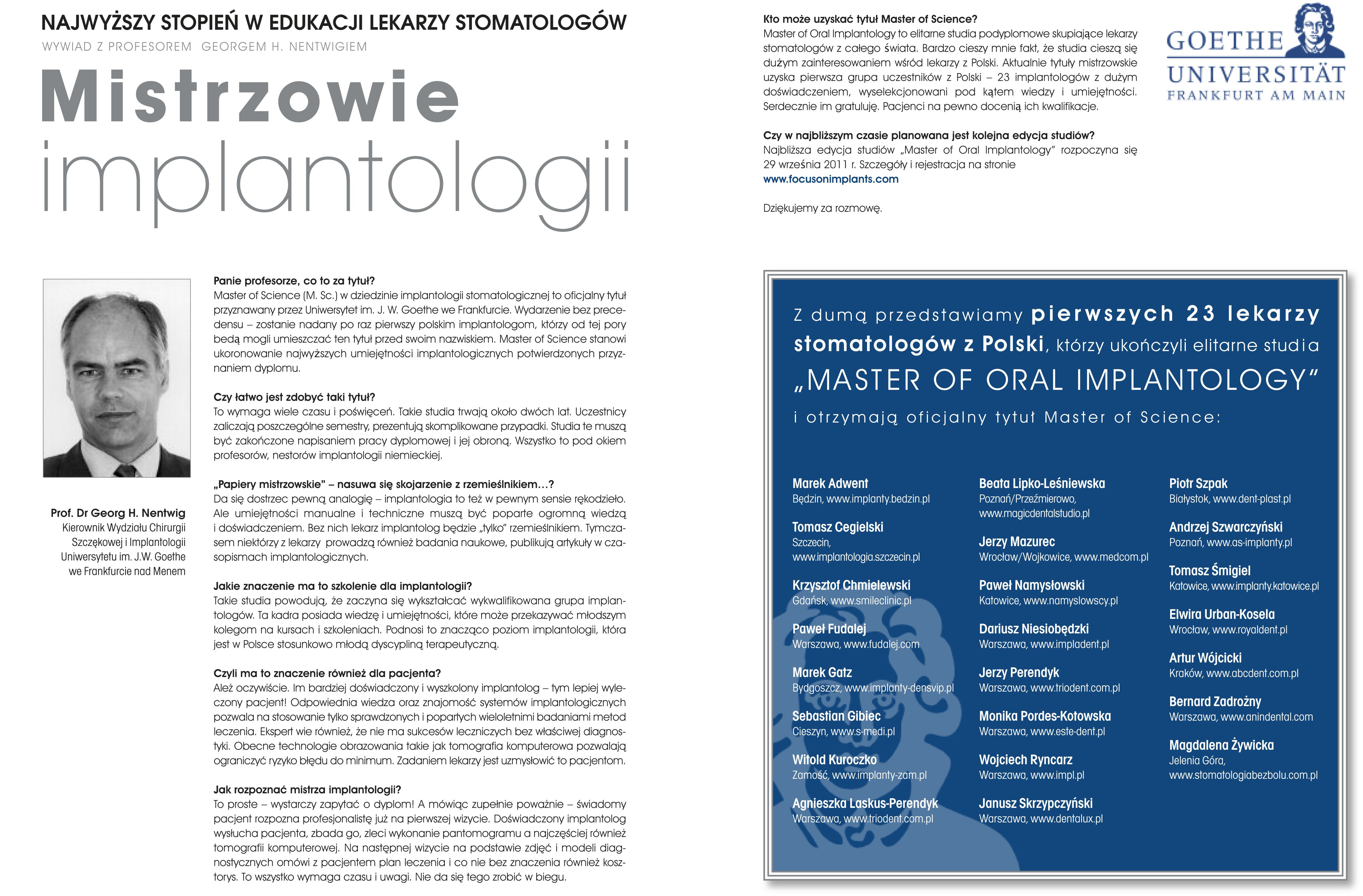 Dyplomy ukończenia studiów Master of Science in Oral Implantology zostały rozdane wszystkim polskim lekarzom implantologom stomatologicznym podczas uroczystej gali I kongresu Master of Oral Implantology, który miał miejsce we Frankfurcie 16 marca 2013 roku. Warto przy tym wspomnieć, że Polacy tworzyli pierwszą grupę studentów i dopiero po nas zaczęły dołączać kolejne nacje, tworząc międzynarodową rodzinę Mistrzów Implantologii.