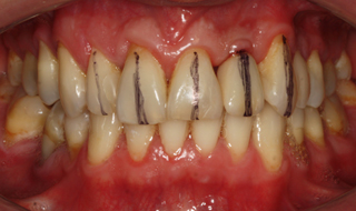 Wyznaczenie osi długich zębów w szczęce – dla zobrazowania wad pracy protetycznej, wyznaczono osie długie zębów siecznych