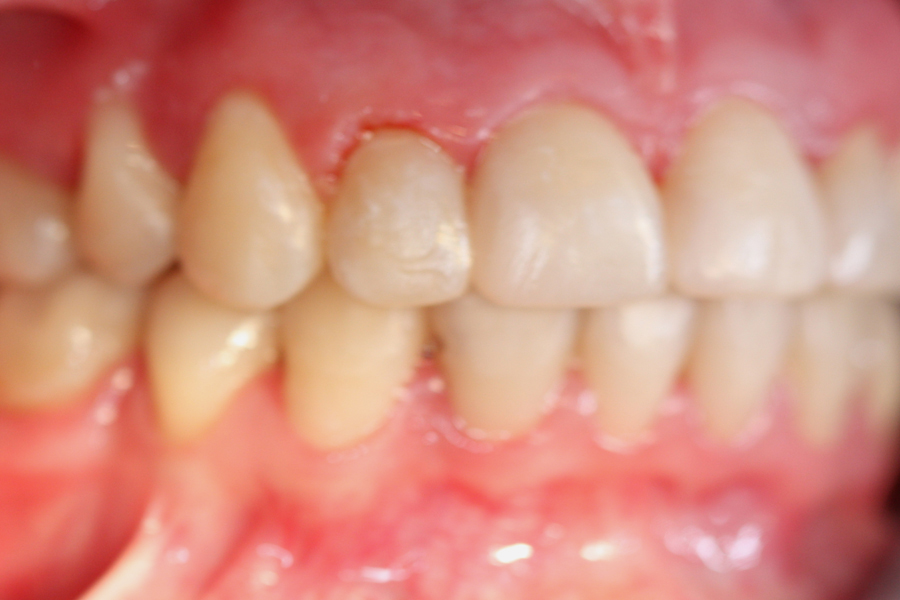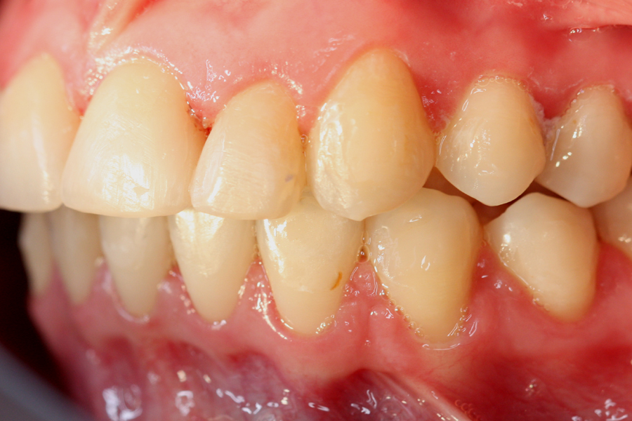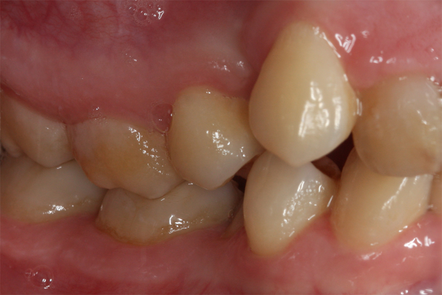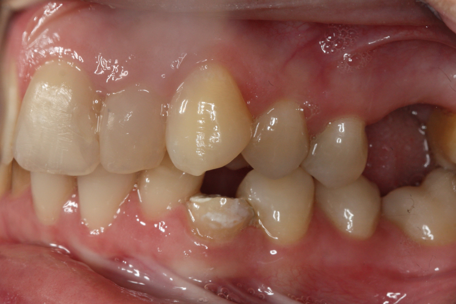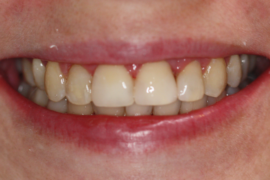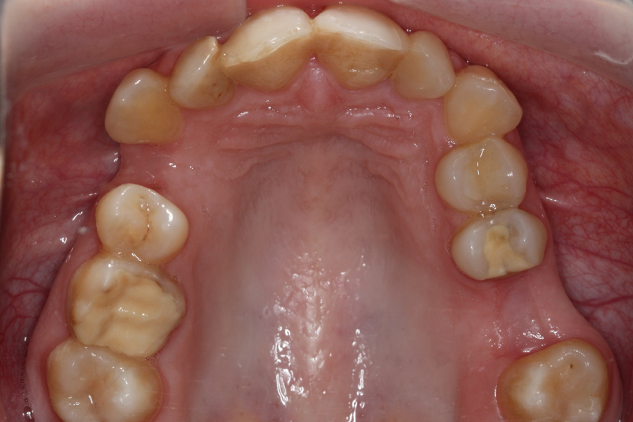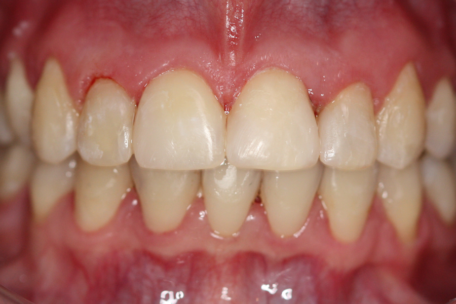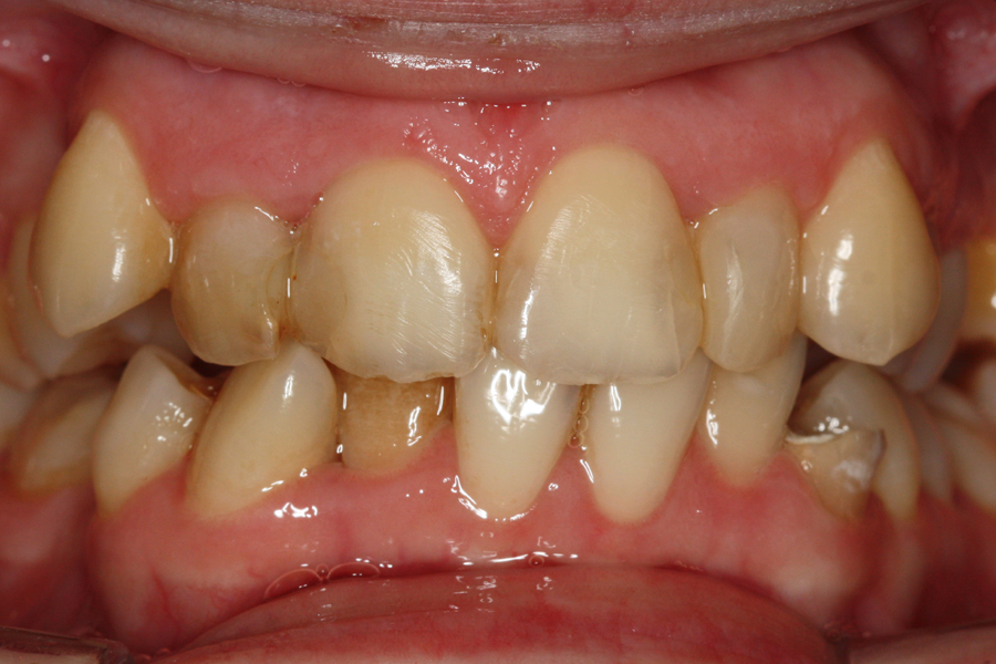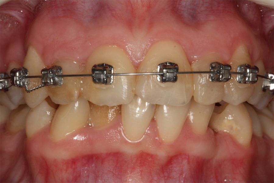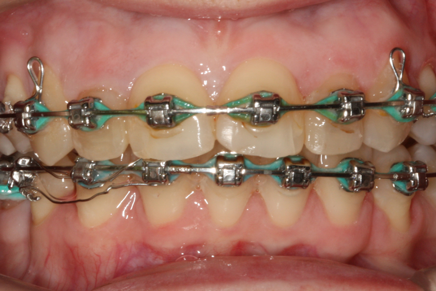 Młoda pacjentka zgłosiła się do naszego gabinetu celem wykonania kompleksowego leczenia zachowawczo-ortodontycznego. Oprócz problemów natury ortodontycznej stwierdzono złą higienę jamy ustnej oraz liczne potrzeby leczenia zachowawczo-endodontycznego. Po wnikliwej analizie telerentgenowskiej oraz analizie modeli zadecydowano o ekstrakcji 2 zębów w łuku dolnym (kła po stronie lewej oraz pierwszego przedtrzonowca po stronie prawej). Plan leczenia obejmował ponadto zamknięcie łuku po brakujących zębach w łuku górnym. Leczenie aktywne trwało 2 lata i 8 miesięcy. W czasie jego trwania pacjentka była regularnie poddawana zabiegom higieny profesjonalnej celem eliminacji zapaleń przyzębia brzeżnego. Po leczeniu aktywnym zastosowano leczenie retencyjne w postaci retainera stałego w żuchwie oraz szyny retencyjnej w łuku górnym.