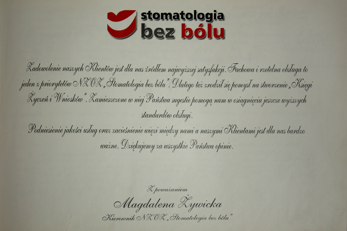 W związku z doświadczeniami przeżytymi w Waszym zakładzie proszę o rozważenie możliwości zmiany na „Stomatologia z Przyjemnością”. Z poważaniem.