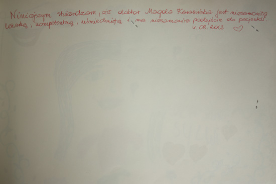 Ogromne podziękowanie dla Pani dr Ewy Ziemby-Popławskiej za opiekę, za serce, które wkłada w to co robi, to wspaniały człowiek i świetny fachowiec, posiadający talent i intuicję.