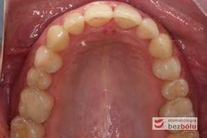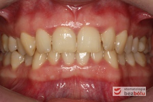 Pacjentka lat 28 zgłosiła się do naszej placówki celem podjęcia leczenia ortodontycznego. Głównym problemem jaki zgłaszała była chęć poprawy estetyki uśmiechu. Tak jak obligatoryjnie w przypadku każdego pacjenta wykonano analizę cefalometryczną, analizę modeli oraz tkanek miękkich wchodzących w skład układu stomatognatycznego. Ze względu na miejsce zamieszkania pacjentki za granicą zaplanowano leczenie aparatem stałym w systemie niskiego tarcia (DAMON), który umożliwił rzadsze wizyty kontrolne. Aktywna faza leczenia zajęła 12 m-cy. Po zdjęciu aparatu rozpoczęto leczenie retencyjne w postaci szyny retencyjnej w łuku górnym oraz retencji stałej w łuku dolnym.