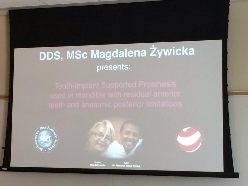 Prezentacja pt. „Tooth-Implant Supported Prosthesis used in mandible with residual anterior teeth and anatomic posterior limitations”, przedstawiona przez DDS, MSc. Magdalenę Żywicką, spotkała się z bardzo dużym zainteresowaniem i wyjątkowym docenieniem, okazanym przez prof. Lyndon Coopera i dr Fernando Rojas Vizcaya. Nasza szefowa otrzymała także wiele ciepłych słów uznania, przekazanych przez kolegów lekarzy z Polski, uczestniczących w tym kursie.