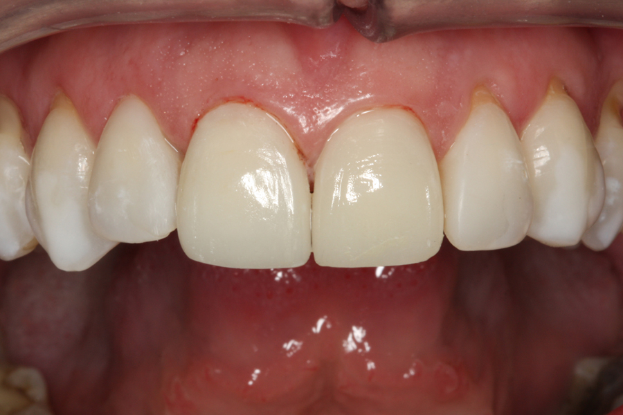 Młoda pacjentka zgłosiła się do placówki celem poprawy estetyki uzębienia w odcinku przednim. Zastane uzębienie charakteryzowało się przebarwieniami, nieszczelnymi wypełnieniamimartwą jedynką lewą. Stan uzębienia powodował dyskomfort pacjentki w codziennych kontaktach międzyludzkich. Po konsultacji z pacjentką określono plan leczenia, polegający na zastosowaniu profesjonalnej higienywybielania, umiejscowieniu w odcinku przednim porcelanowej licówki oraz korony pełnoceramicznej a w siekaczach bocznych wypełnień kompozytowych.