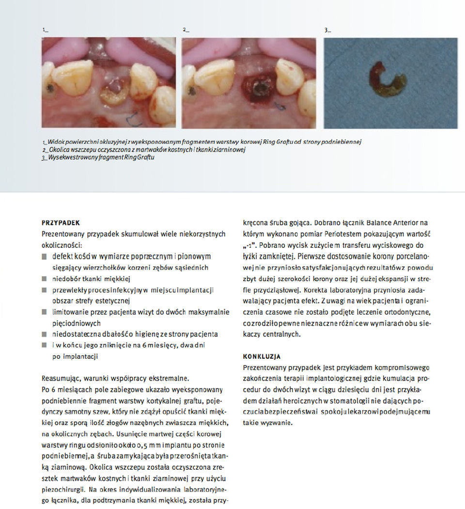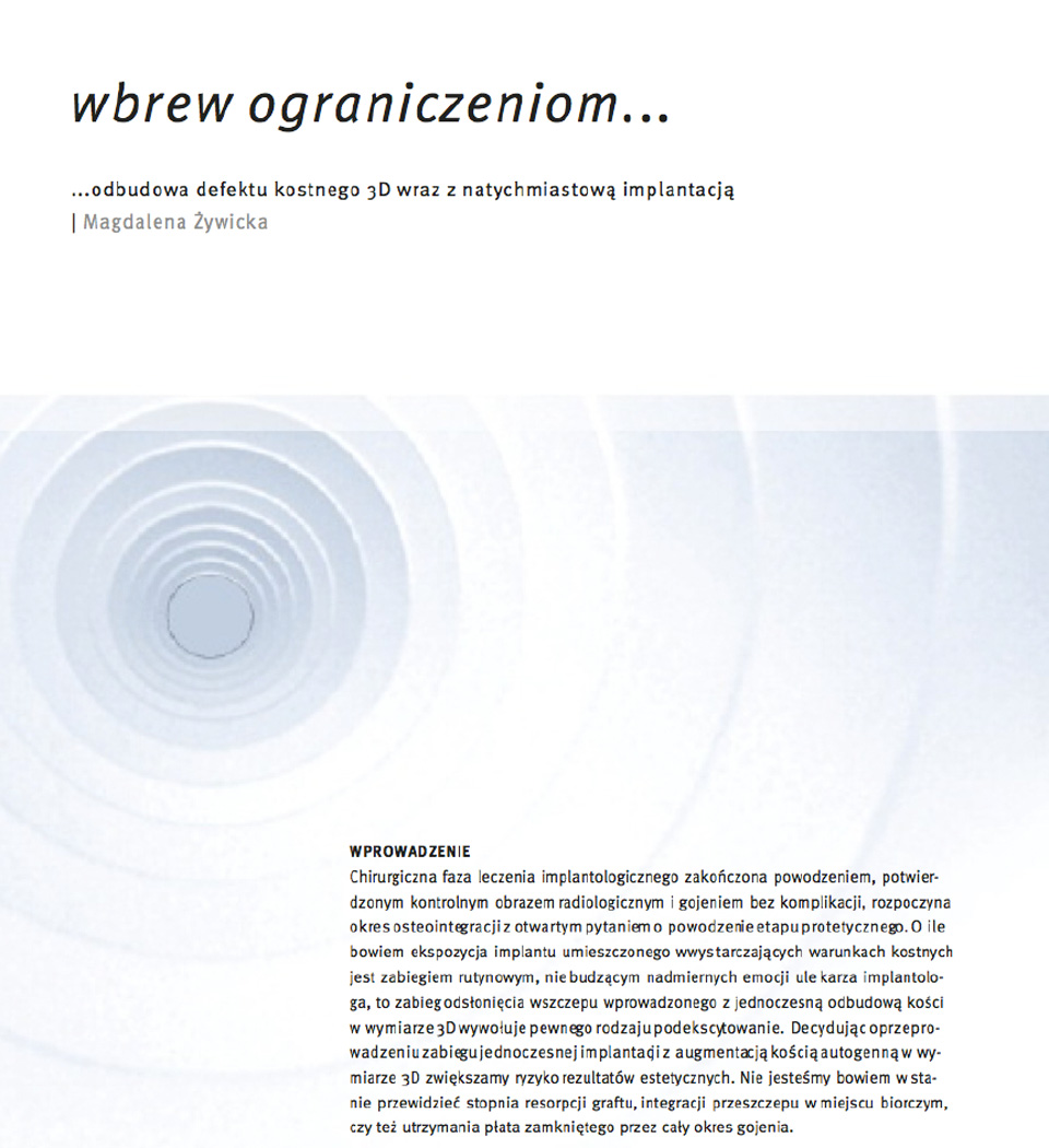 Poniżej prezentujemy Państwu artykuł pt. „Wbrew ograniczeniomodbudowa defektu kostnego 3D wraz z natychmiastową implantacją” napisany przez Dr Magdalenę Żywicką dla czasopisma stomatologicznego „Identity” nr 1/2012.