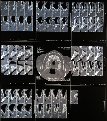 1. Szczegółowa diagnostyka przy użyciu tomografu komputerowego w celu precyzyjnego określenia objętości kości i ustalenia pozycji implantów w żuchwie i szczęce