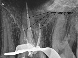 Pacjent lat 28 trafił do naszego gabinetu z powodu z powodu ćmiących dolegliwości bólowych zęba trzonowego górnego. Był on uprzednio leczony endodontycznie, lecz nie spowodowało to ustąpienia objawów. Po skierowaniu na leczenie endodontyczne przy użyciu mikroskopu zabiegowego uwidoczniono dodatkowy – czwarty i piąty kanał zęba. Po opracowaniu chemo – mechanicznym całego systemu korzeniowego i wypełnieniu kanałów termiczną gutaperką dolegliwości ustąpiły a ząb został odbudowany ze wzmocnieniem włóknem szklanym. Takie standardowe postępowanie lecznicze często obecnie wzbogacane o diagnostykę trójwymiarową 3D przy użyciu tomografii wolumetrycznej CBCT pozwala na jeszcze skuteczniejszą terapię endodontyczną i eliminację bólów często pierwotnie trudnych do zdiagnozowania i wyleczenia.