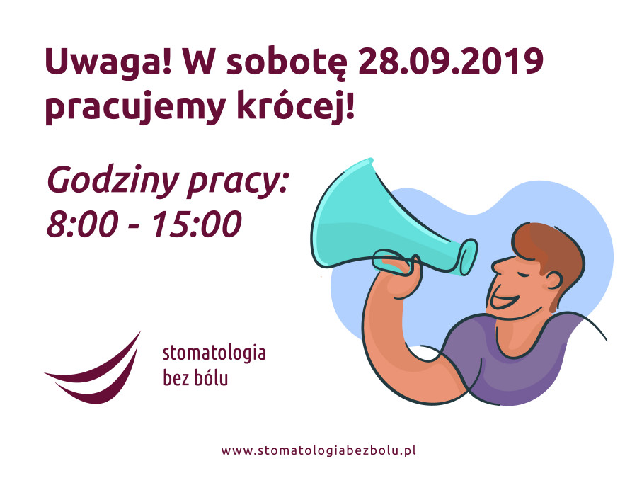 UWAGA! W dniu 28.09.2019 nasza placówka będzie wyjątkowo czynna krócej do godziny 15:00. Serdecznie przepraszamy za utrudnienia.