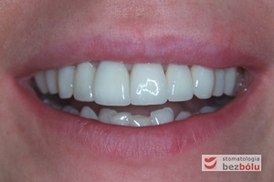 Młoda i urodziwa pacjentka zgłosiła się celem poprawy kształtu i koloru swoich zębów w szczęce a także korekty istniejących wad zębowych i deficytu kła po stronie prawej, będącego przyczyną przesunięcia linii pośrodkowej na stronę prawą. Wykonano estetyczne korony pełnoceramiczne w przednim odcinku łuku górnego, które zacementowano na filarach zębów własnych pacjentki. Proponowane leczenie ortodontyczne zostało przez pacjentkę odrzucone.