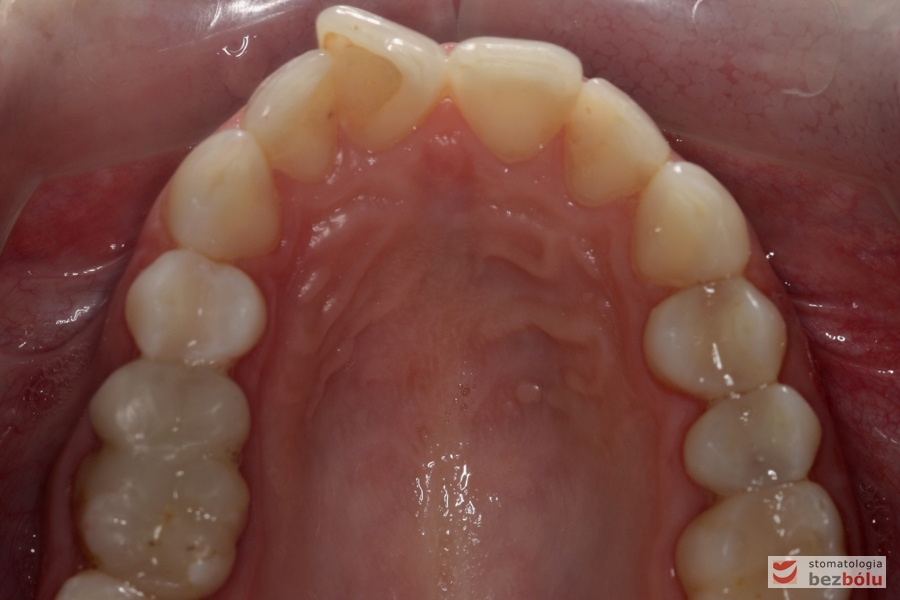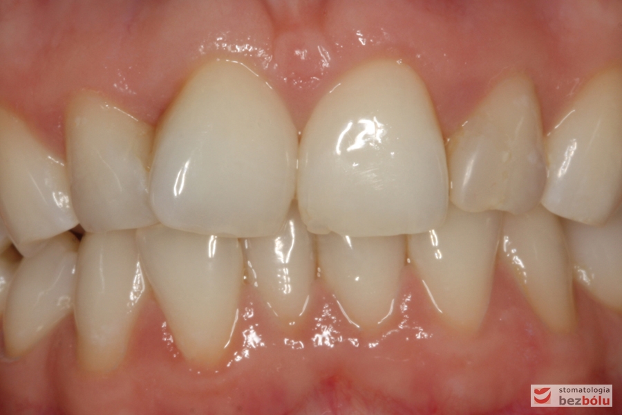 Zaburzone proporcje siekaczy bocznych w stosunku do centralnych, starcie patologiczne na kle górnym po stronie prawej