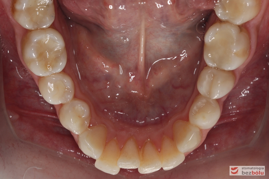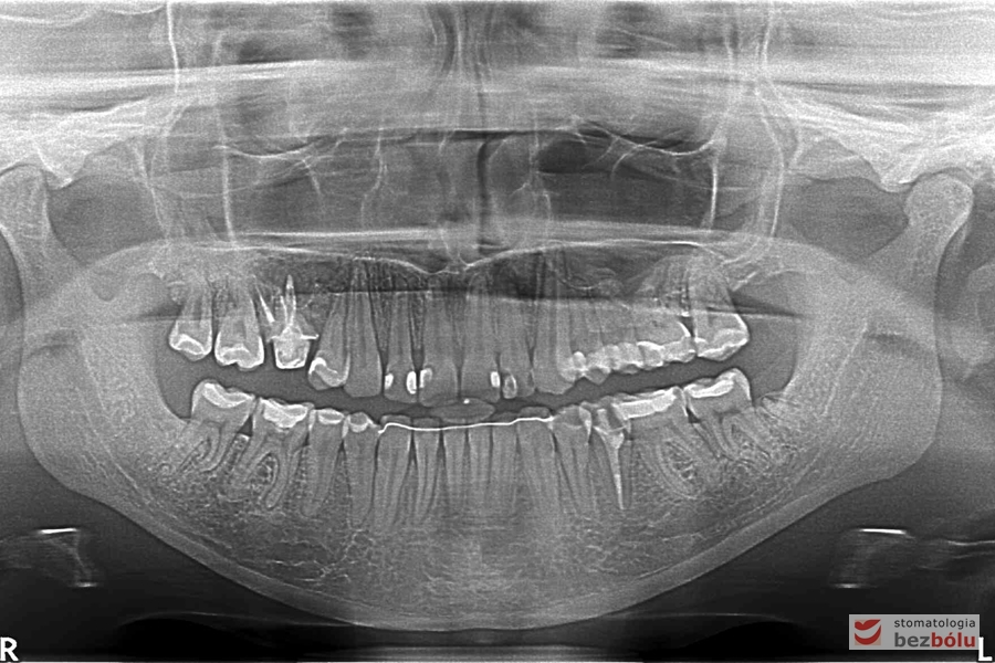 W żuchwie widoczne stłoczenia w rejonie siekaczy i ujemny tork na zębach trzonowych po stronie lewej.