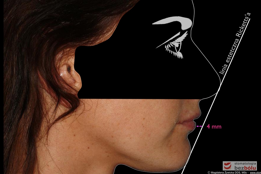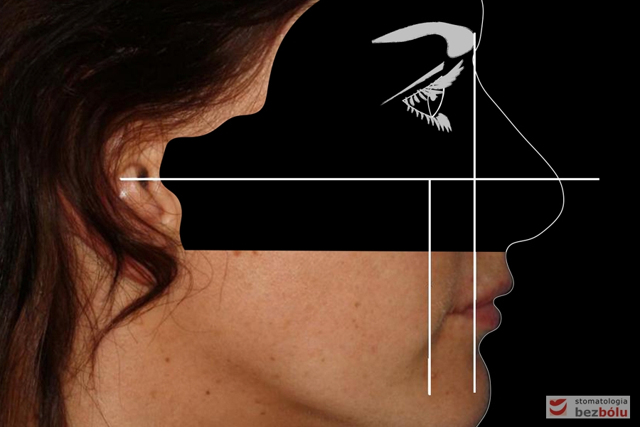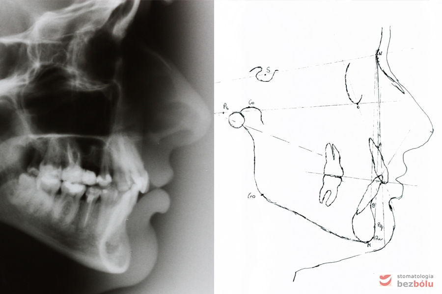 Analiza profilu twarzy wg Ricketts’a, prawidłowa pozycja szczęki i dotylna pozycja żuchwy względem czaszki, siekacz zbyt wychylony