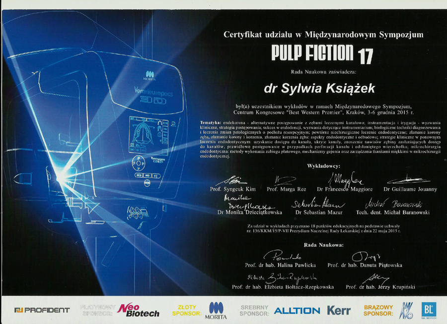W dniach 03-05.12.2015 w Centrum Konferencyjnym „Best Western Premier Hotel” w Krakowie odbyła się kolejna, już 17 sesja cyklicznej konferencji endodontycznej „Pulp Fiction”. Jak co roku wydarzenie to zgromadziło znamienite grono wykładowców z całego świata, takich jak: prof. Syngcuk Kim, prof. Marga Ree, dr Guillaume Jouanny, dr Francesco Maggiore, dr Monika Dzieciątkowska, tech. dent. Michał Baranowski oraz dr Sebastian Mazur. Dodatkowo sesje przedpołudniowe wypełniały znakomite warsztaty praktyczne prowadzone przez prof. Syngcuk Kim’a, dr Jerzego Zbożenia oraz dr Tomasza Machana. Ponadto dr Monika Dzieciątkowska poprowadziła znakomity wykład z adhezji i endokoron.