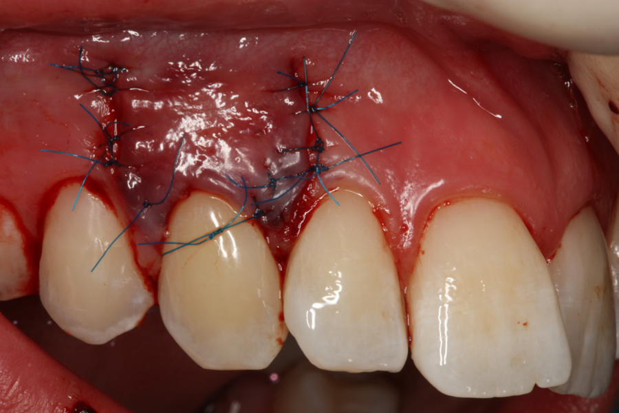 Stan po przesuniętym płacie dokoronowo przy zębie 13, szycie chirurgiczne