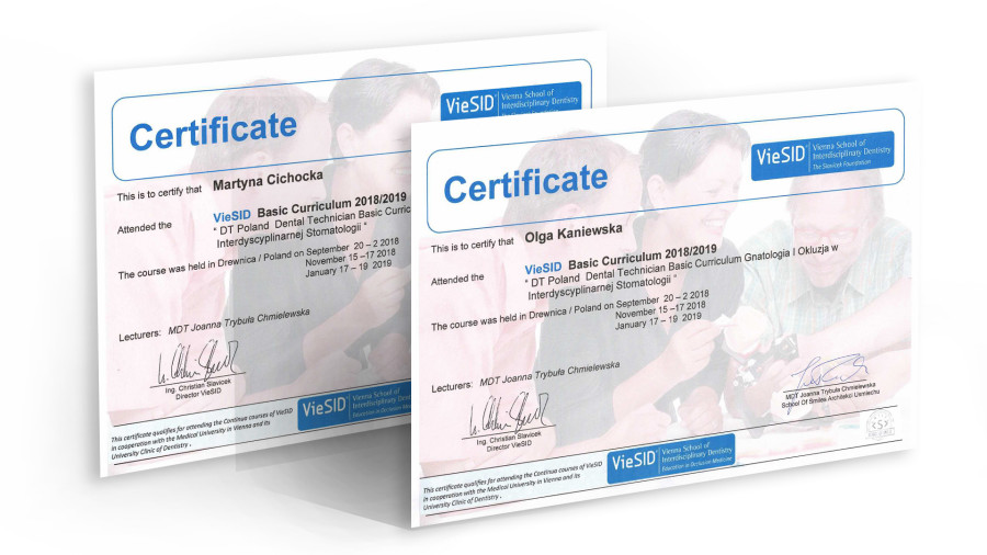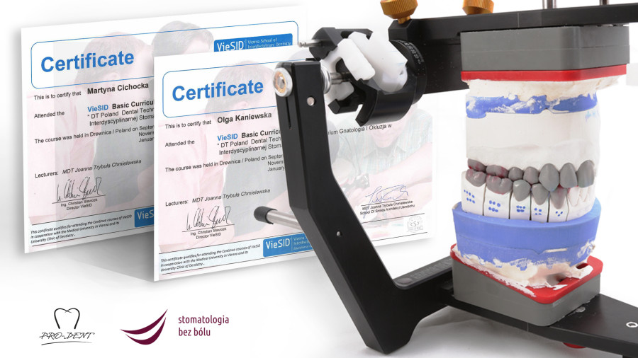 W miniony weekend nasze techniczki Olga Kaniewska i Martyna Cichocka ukończyły pierwszą edycje praktycznego kursu z planowania prac według wiedeńskiej koncepcji prof. Rudolfa Slavicka VieSID – Vienna School of Interdisciplinary Dentistry. W trakcie trzech intensywnych modułów, uczestnicy uczyli się woskować pełne łuki zębowe we wszystkich trzech klasach zgryzowych. Oprócz tego wykonali bruxchecker oraz szynę miopatyczną.