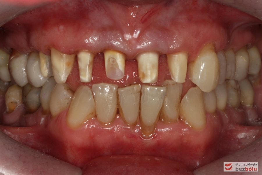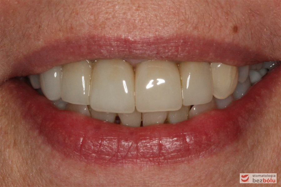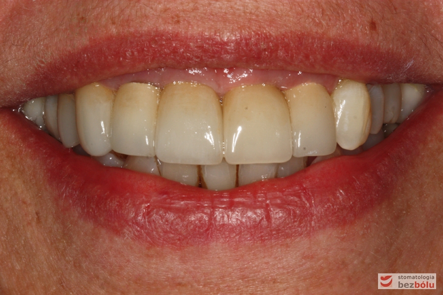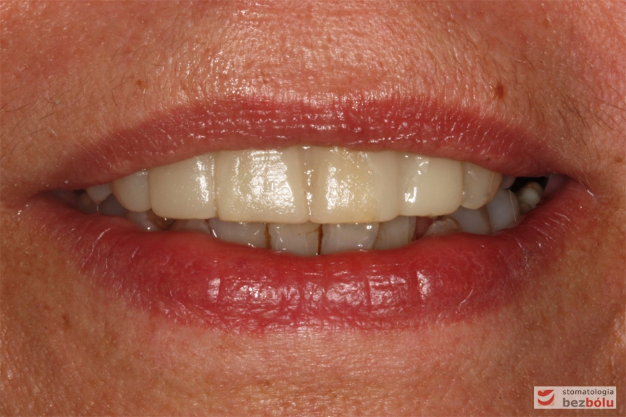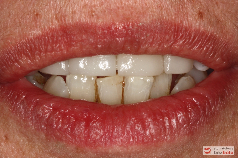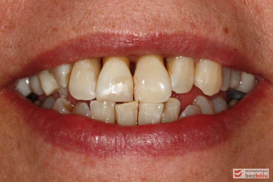 Pani w średnim wieku ze świadomością deficytów estetycznych uzębienia, zgłosiła się celem uporządkowania jamy ustnej. Swoje oczekiwania opierała na doświadczeniu lekarza prowadzącego. Co unikalne w obecnych czasach nie naciskała na tempo leczenia i chciała metodycznie doprowadzić swoje uzębienie do optymalnego stanu. Główną skargą były wydłużone siekacze centralne, stłoczenia, dyskoloracje i cechy choroby przyzębia.