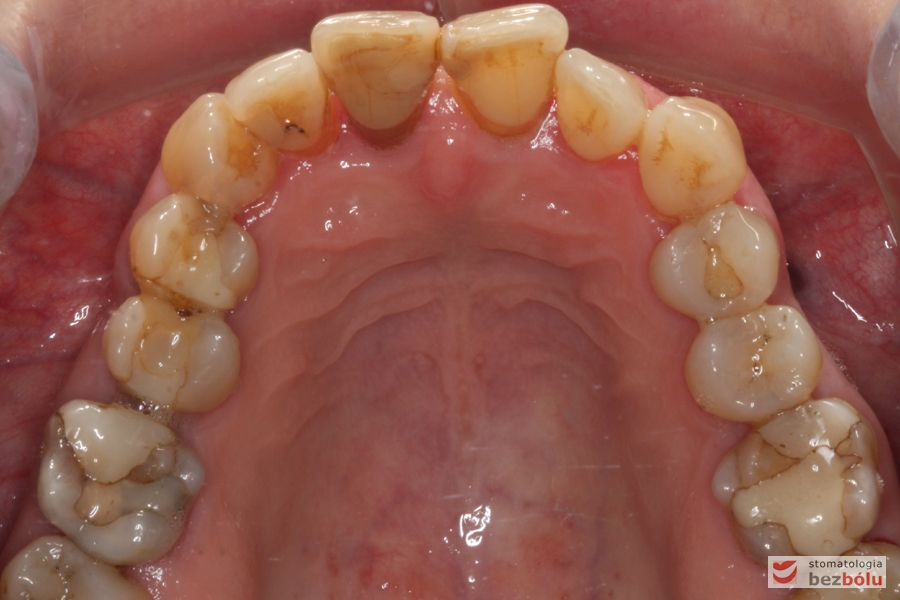 Szczęka – widok powierzchni okluzyjnej, stłoczenia i rotacje w odcinku przednim, zużyte wypełnienia w strefach bocznych