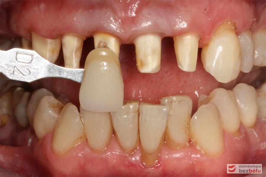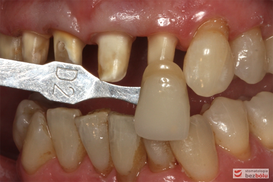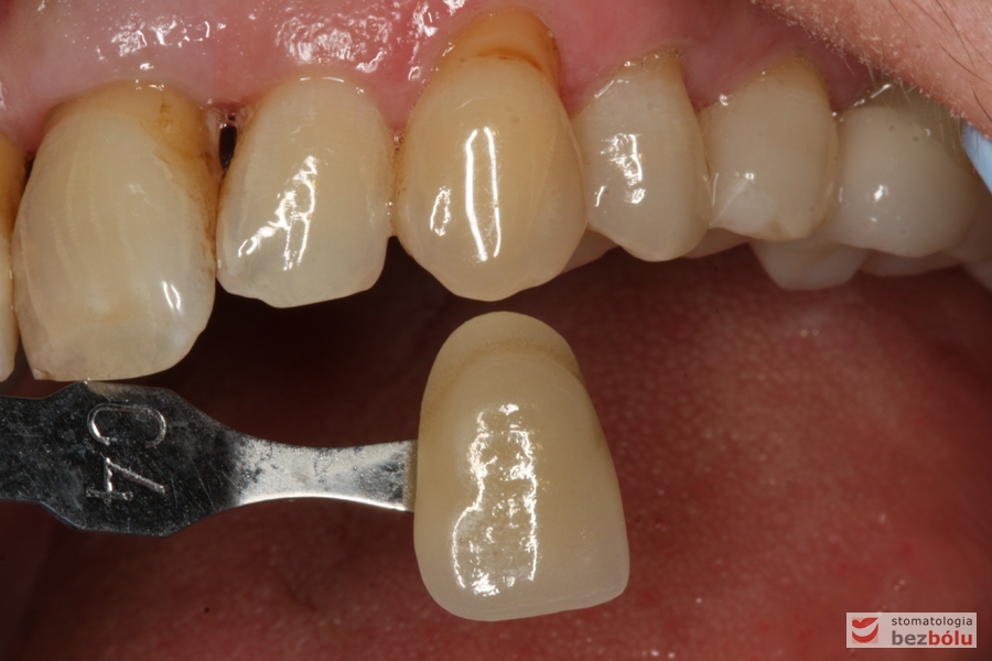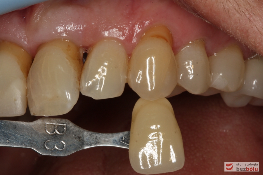 Dobór koloru dla nowych zębów – dobór koloru w odniesieniu do górnego kła po lewej stronie