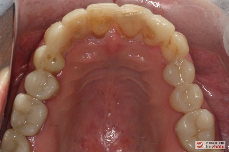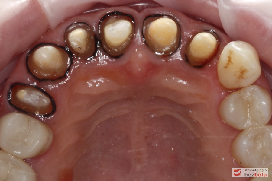 Powierzchnia okluzyjna łuku górnego – sześć filarów protetycznych tuż przed zacementowaniem koron