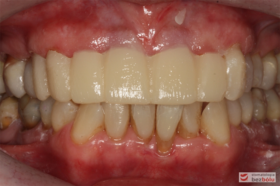 Oba łuki w zgryzie – widok frontalny, opracowane filary protetyczne na zębach własnych w szczęce
