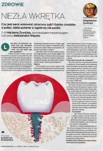 4 czerwca 2016r. w magazynie Wysokie Obcasy ukazał się obszerny wywiad z dr Magdaleną Żywicką MSc, fundatorką i kierownikiem medycznym NZOZ Stomatologia Bez Bólu. Dziennikarka Gazety Wyborczej i jej dodatku Wysokie Obcasy – Aleksandra Więcka, która przeprowadziła ten wywiad – w dzieciństwie miała problemy z zębem trzonowym, który został przedwcześnie usunięty. Kierowana własną historią postanowiła się dowiedzieć więcej na ten temat. Zadawała bardzo ciekawe pytania, których celem było potwierdzenie lub zasianie wątpliwości dot. implantacji jako metody terapeutycznej.